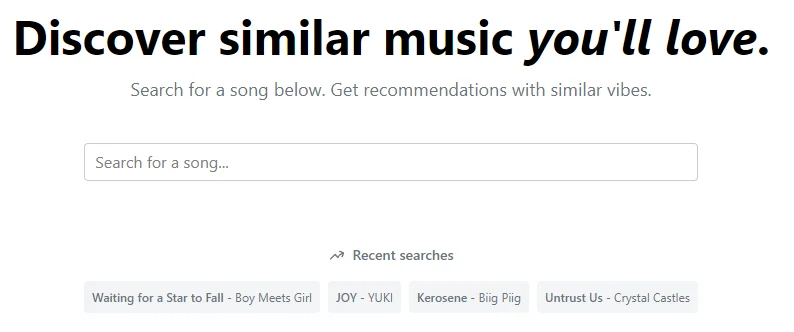 Этот инструмент позволяет пользователям искать песню и получать рекомендации с похожими вибрациями Этот инструмент позволяет пользователям искать песню