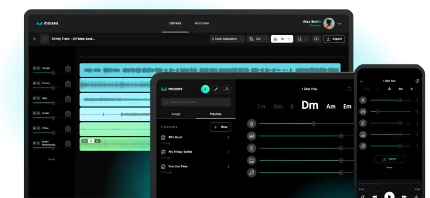 Удалить вокал и инструменты из песен Moises-это приложение с AI, которое позволяет музыкантам играть со своими любимыми артистами в любом ключе и на любой скорости.