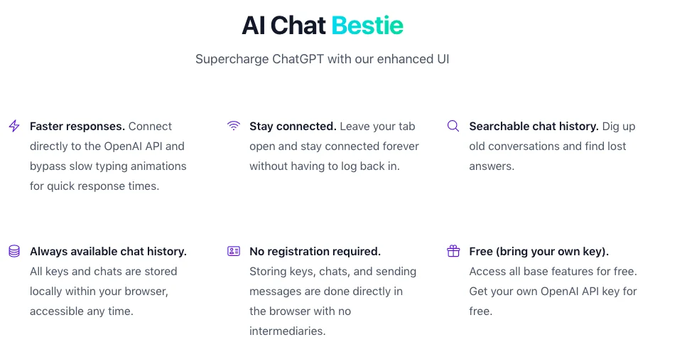 Инструмент для ускорения ответов в чате и поиска истории чата. AI Chat Bestie – это инструмент, который улучшает пользовательский опыт ChatGPT, позволяя