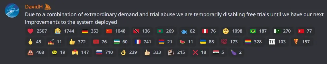 Midjourney объявил о временном отключении бесплатных пробных версий программы. Компания отмечает, что причиной является необычно высокий спрос на пробные версии и злоупотребление ими. Midjourney заявляет, что будет работать над улучшениями системы и вновь активирует пробные версии после их завершения.