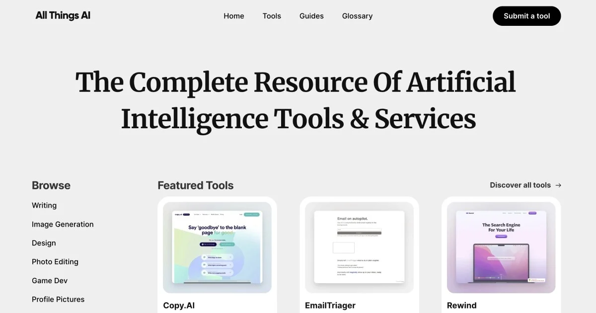 Комплексный каталог инструментов и услуг ИИ Allthingsai – это ресурс инструментов и услуг искусственного интеллекта. Он обеспечивает доступ к широкому