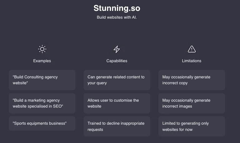 Генератор веб-сайтов с пользовательским контентом. Stunning.so – это инструмент, который использует искусственный интеллект, чтобы помочь пользователям