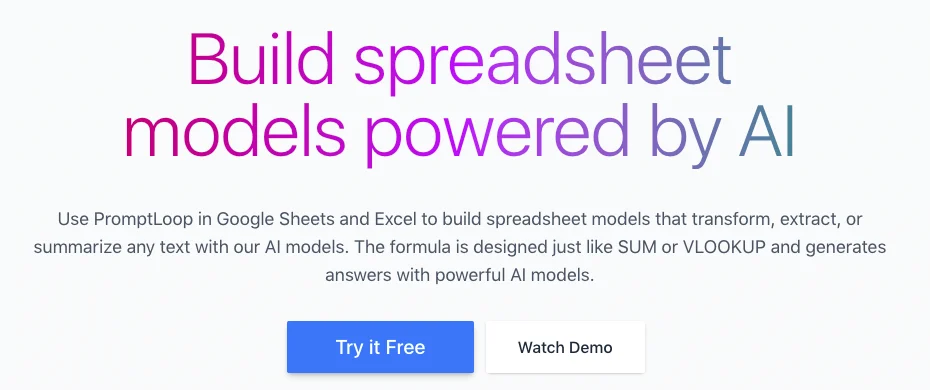 Инструмент для преобразования, извлечения или обобщения любого текста в Google Sheets и Excel. PromptLoop – это формула для электронных таблиц, которая