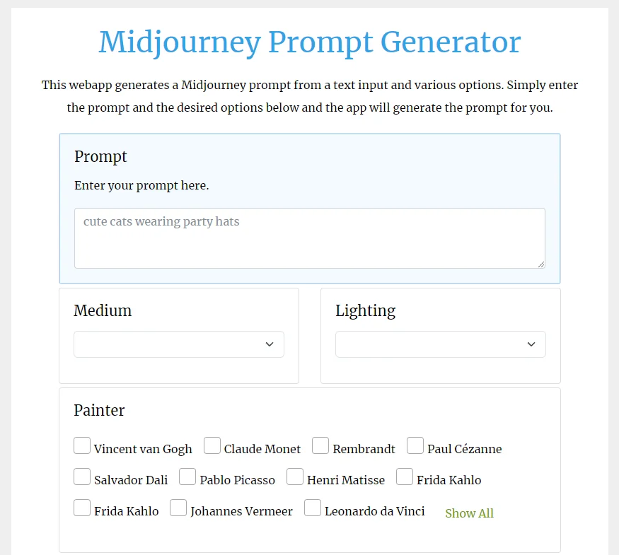 Генератор промптов Midjourney Generator Midjourney Generator – это веб -приложение, которое генерирует подсказки на основе текстового ввода и различных параметров.