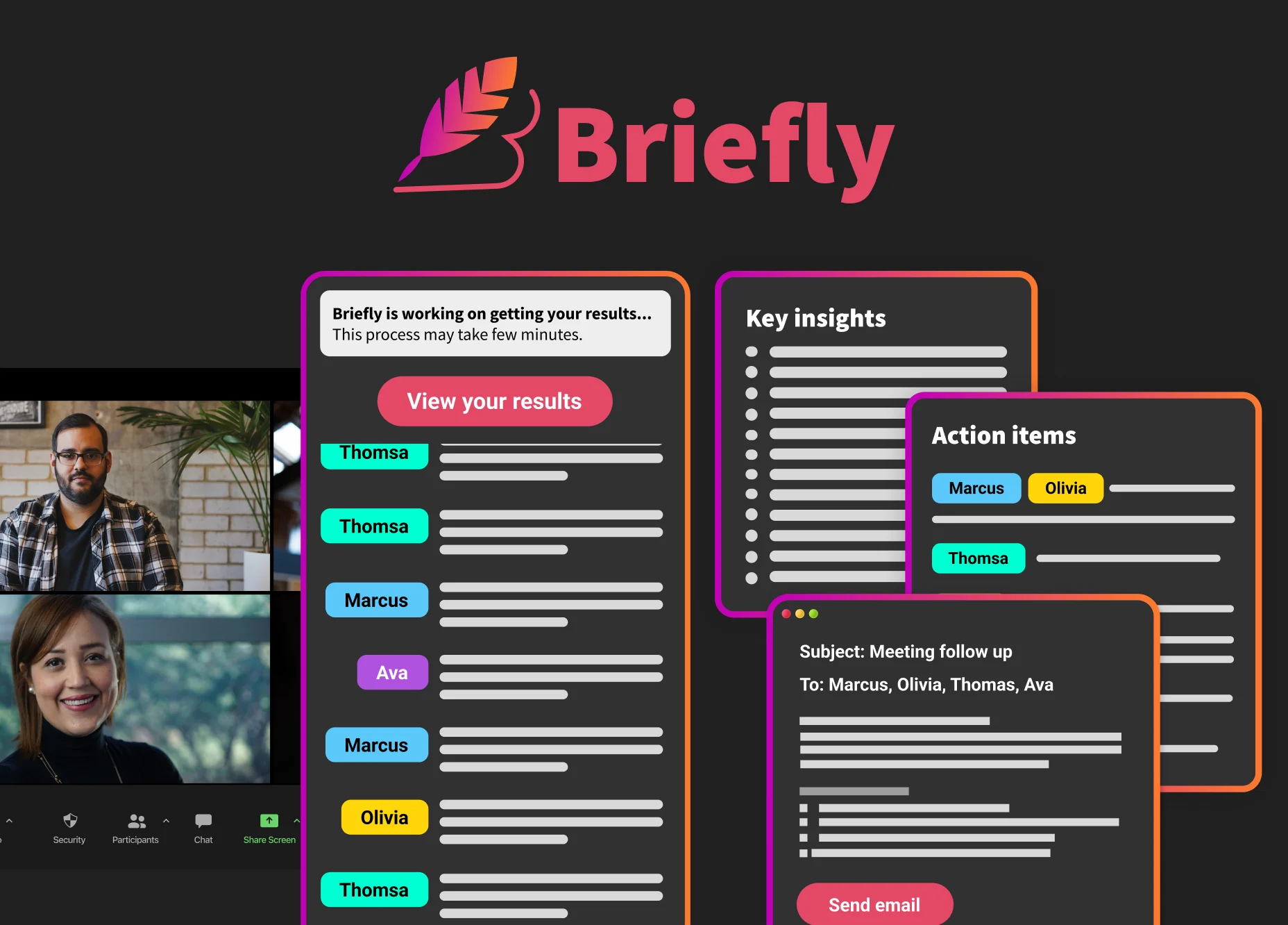 Инструмент для автоматизации расшифровки совещаний, составления резюме и последующих писем.