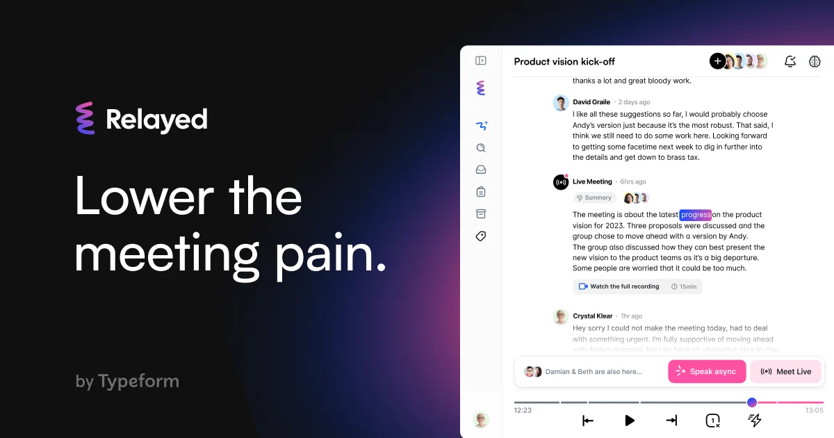 Помощник ИИ для видеозвонок Relayed-это инструмент для видеоконференций с AI, предназначенный для того, чтобы помочь командам победить удаленную работу