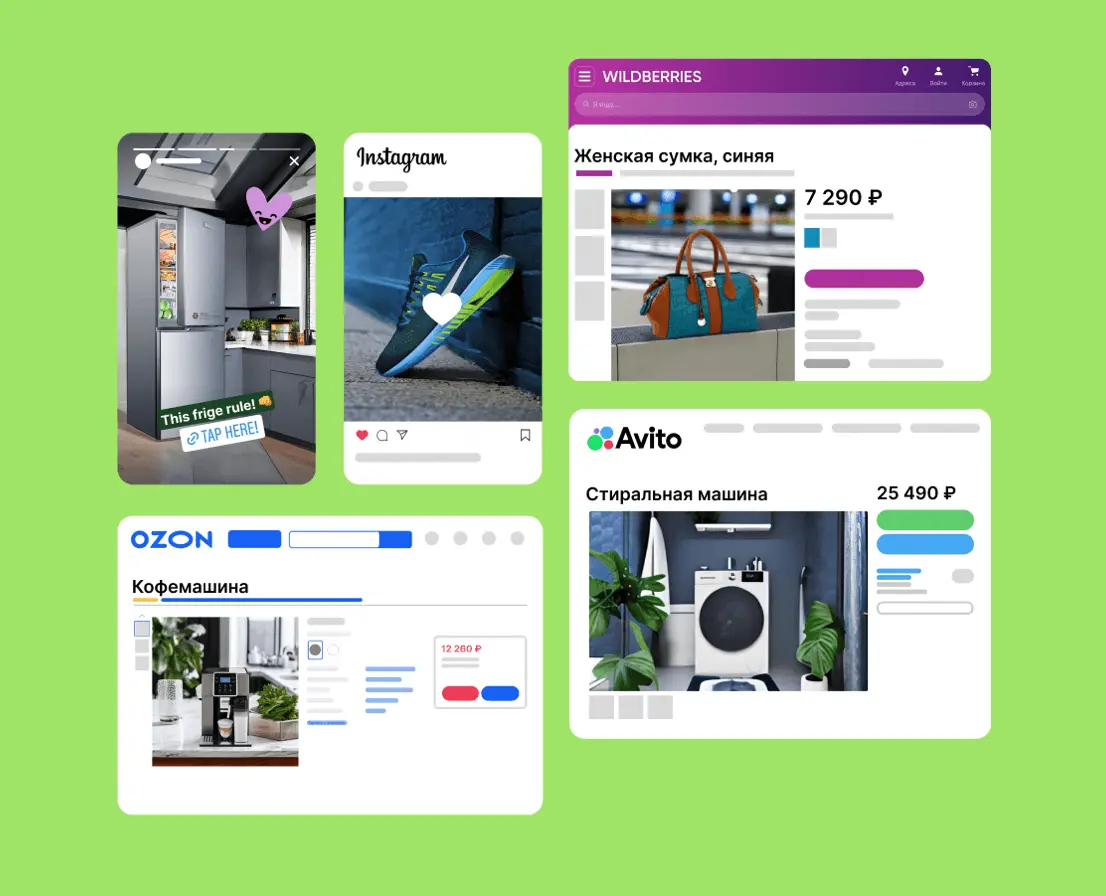 - Гибкость и адаптивность к различным потребностям бизнеса, благодаря использованию нейросетей для карточек маркетплейса, таких как Ozon, Wildberries, Avito, или соцсетей.