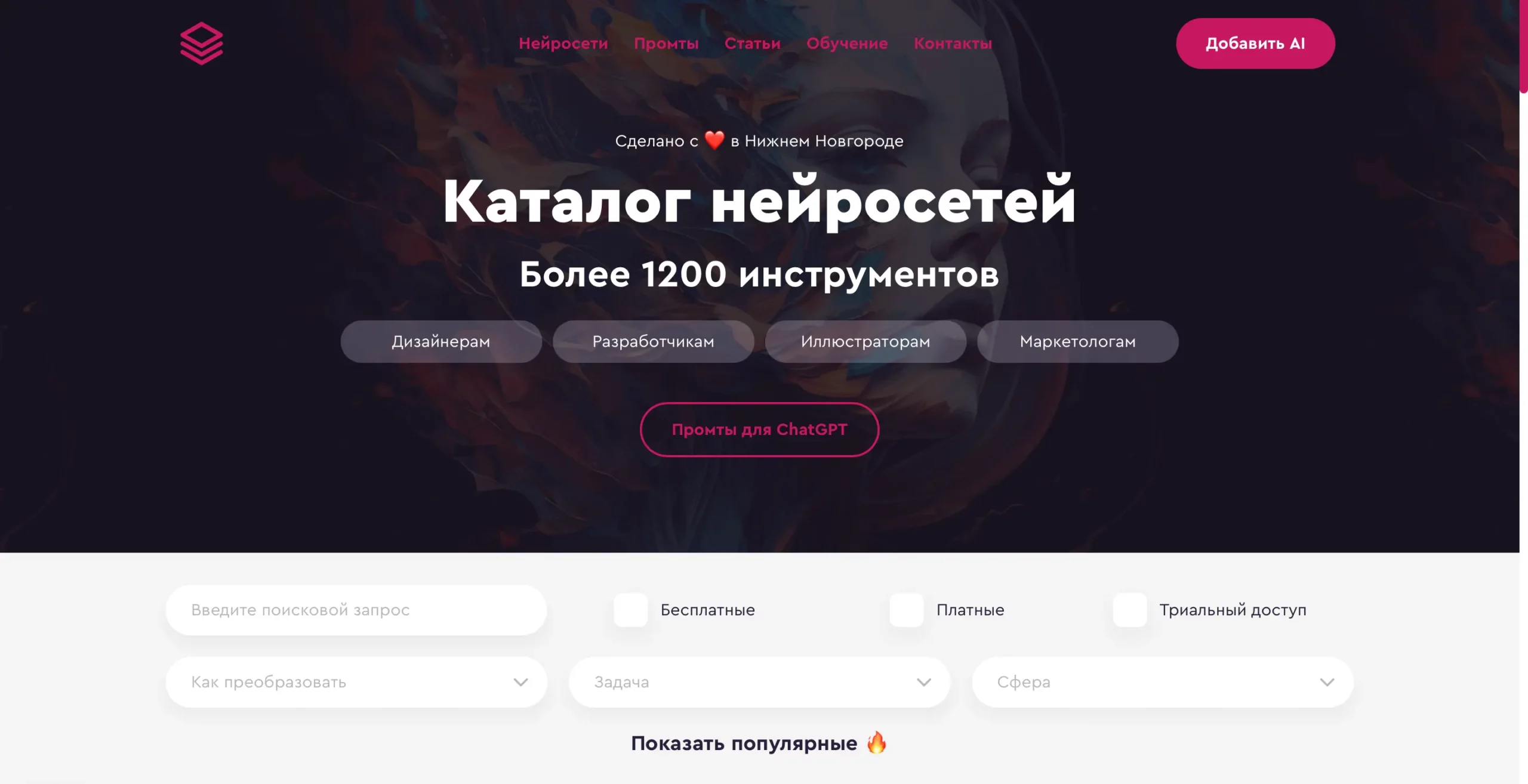На нашем сайте вы также можете найти инструменты на базе искусственного интеллекта на русском языке по разным категориям: