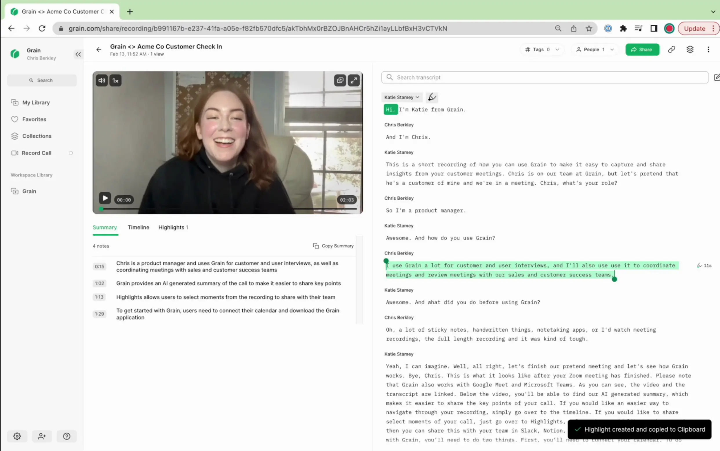 Grain – это инструмент на основе искусственного интеллекта, который помогает командам раскрыть ценность встреч с клиентами. Он обеспечивает точное резюме встреч с клиентами, позволяя пользователям легко вспоминать, фиксировать и делиться ключевыми моментами. Grain также помогает пользователям перейти к ключевым моментам интервью с клиентами и получить необходимые сведения за считанные секунды. Кроме того, с его помощью команды легко социализируют информацию о клиентах, используя резюме в один клик, что позволяет им учитывать мнение клиентов при принятии каждого решения.