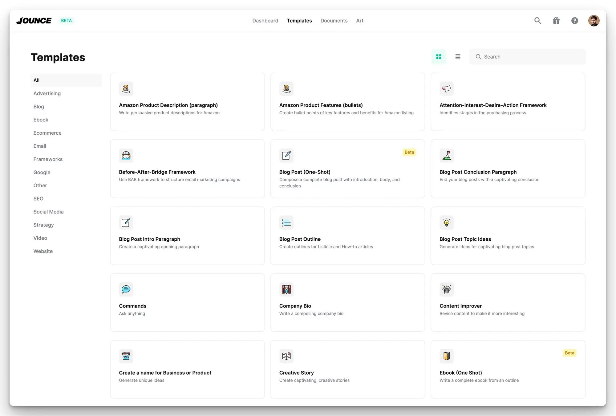 Jounce – это решение для копирайтинга на основе искусственного интеллекта, которое помогает маркетологам, владельцам малого бизнеса и создателям контента быстро и легко создавать профессиональный, эффективный контент. В нем есть множество настраиваемых шаблонов, редактор документов на основе искусственного интеллекта, темный режим, неограниченное количество членов команды и более 70 маркетинговых шаблонов. С его помощью можно создавать конспекты блогов, посты в социальных сетях, электронные письма, содержание веб-сайтов, описания продуктов, рекламные тексты, заголовки и стратегии кампаний.
