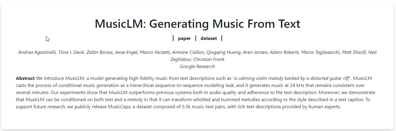 Инструмент MusicLM-это модель для создания музыки высокой точки зрения из описаний текста. Модель представляет собой иерархическую задачу моделирования последовательности к последовательности, которая генерирует музыку при 24 кГц, которая остается последовательной в течение нескольких минут. Инструмент может установить сгенерированную музыку как на тексте, так и на мелодии, позволяя ему преобразовать свистные и напеченные мелодии в соответствии со стилем, описанным в текстовой подписи. Инструмент также способен генерировать музыку из описаний живописи, инструментов, жанров, уровней опыта музыканта, мест и эпох. Кроме того, инструмент способен генерировать разнообразные версии одной и той же текстовой подсказки и одни и те же семантические жетоны.
